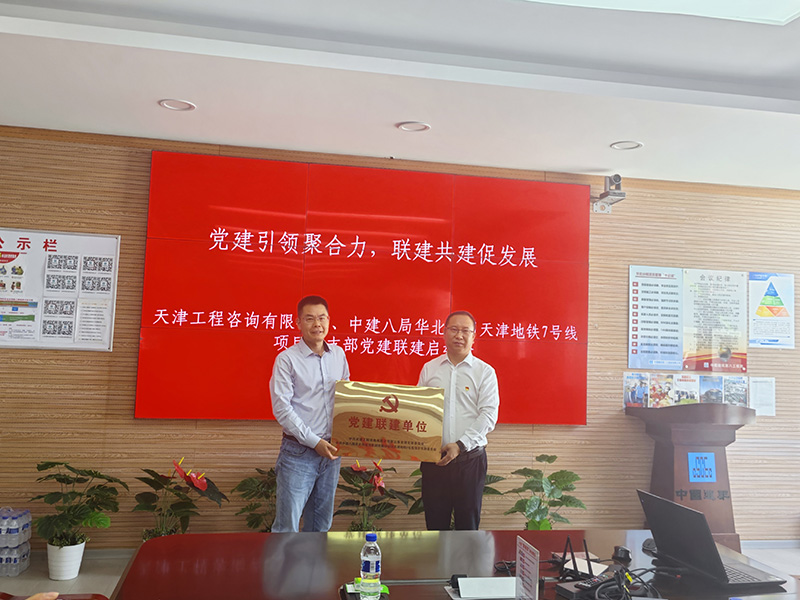 5月20日,為進一步加強天津地鐵七號線參建單位之間的深入交流合作,有力發揮黨組織引領凝聚作用,搭建常態化的溝通交流平臺,推動項目健康、快速、高質量發展,打造優質地鐵工程,在深入開展中央八項規定精神學習教育之際,天津咨詢第三事業部黨支部與中建八局華北分公司六里臺站黨支部開展了主題黨日暨黨建聯建共建活動。天津咨詢公司黨委委員、副總經理鐘海榮、中國建筑第八工程局有限公司華北分公司基礎設施分公司黨總支副書記、執行總經理龐衛濤等出席活動并揭牌。