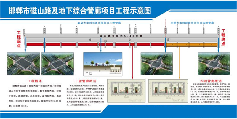 邯鄲市磁山路及地下綜合管廊(秦皇大街-新城東大街)工程,邯鄲市磁山路位于邯鄲市東部地區(qū),起于秦皇大街,經(jīng)荀子大街、廉頗大街、趙王大街、藺相如大街、毛遂大街,終點(diǎn)位于新城東大街上,路線全長(zhǎng)約5.48公里。投資額6.8億元